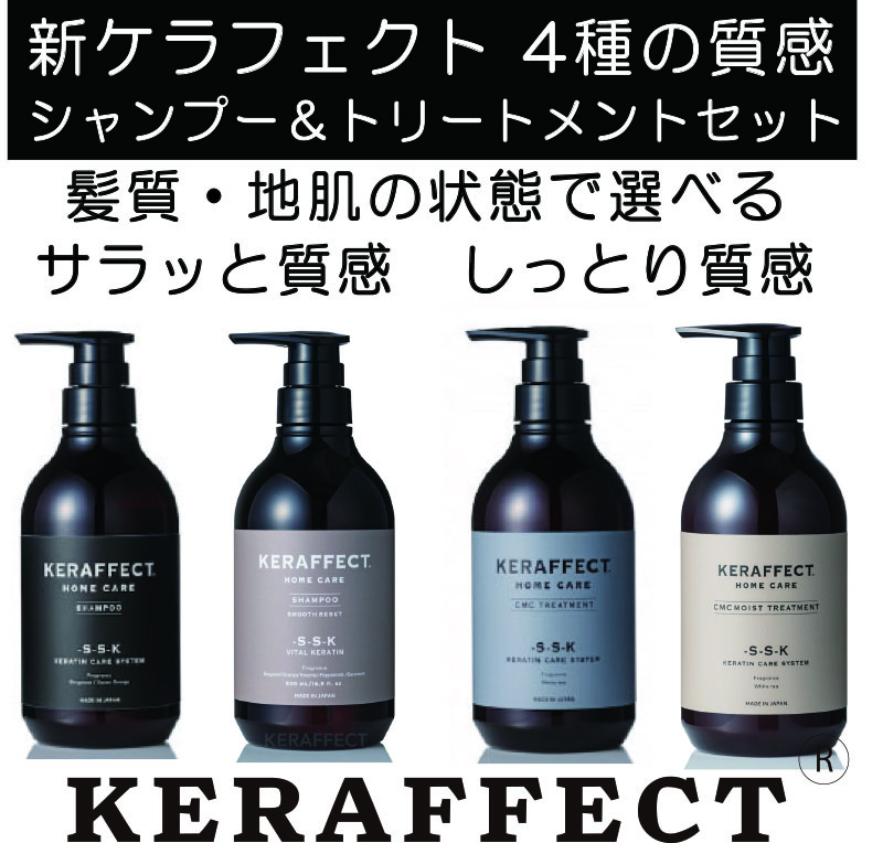 新ケラフェクトシャンプ&トリートメントセット選べる4種の質感【ケラフェクト公式ショップ】 新ケラフェクトシャンプ&トリートメントセット地肌や髪質に合わせて選べる4種類新発売【最短当日出荷】※在庫状況で当日~2、3営業日出荷となります。今なら旅行に便利なケラシャンミニパウチプレゼント中2種の選べるシャンプー●乾燥肌は、「潤いのケラフェクトシャンプー」●オイリー肌は、「さっぱりスムースリセットシャンプー」2種の選べるトリートメント●膨らむ乾燥ダメージ毛には「しっとり潤い保湿CMC MOIST」トリートメント従来のCMCタイプよりさらにCMC(脂質)を増やした保湿特化のトリートメントです。しっとりまとまる質感を実現!液晶コレステロール活性ケラチン(KERATEINE SPW)5種類のナノ化セラミド疎水化セラミド18-MEA 誘導体エルカラクトンファイバーハンス糖アルコール複合体など●細毛、ネコッ毛、つぶれやすい髪には「さらっと潤いCMC」トリートメントダメージで硬く乾燥が気になる髪をさらっと柔らかくしたい方へおすすめです。5種類のナノ化セラミドでダメージ毛の水分と脂質を増やすことに特化しCMC+水分量増加させて髪の潤いを取り戻す高濃度内部浸透型CMCトリートメントです。最新の毛髪補修成分を高濃度配合【ファイバーハンス × 活性ケラチン】毛髪補修ケアと毛髪強度ケアが同時に行えます。ご自宅でサロンクオリティのダメージケアが可能になりました。毛髪内部の「補修」と「強度アップ」に特化したケラフェクトシャンプー&トリートメント●このような髪におすすめです!毎月カラーリングしている方。カラーとパーマをしている方。ブリーチをしている方。縮毛矯正を続けている方。このように施術を繰り返した髪はケラチンが不足して内部ダメージが蓄積されていきます。「ケラチンたんぱく質」が不足すると徐々に髪の強度が弱くなり切れ毛、枝毛、パサつきの原因に!以下のような髪の悩みがでてきます。・最近髪のハリやコシが無くなった?・原因不明の毛先のパサつきがある・うねりクセが強くなってきて、おさまりが悪い・トップにボリュームが出なくなったケラフェクトシャンプー&トリートメントに配合された最新成分がこちら!●ファイバーハンス毛髪内部から髪の強度を高める効果があります。ブドウ糖 ( グルコース ) 由来の特許取得済みの原料毛髪内に水素結合とイオン結合を作り出し毛髪内部のコルテックスで働くよう設計された成分。内部から髪の強度を高め、髪にハリとコシを与えます。毛髪の主成分であるケラチンと結合するため、ケラチン繊維を補強して丈夫で健康な髪へ導きます。●活性ケラチン独自の特許製法によって人の毛髪や肌への吸収性が高い「システイン」を取り出すことに成功。人の毛髪への親和性が非常に高いケラチンで日々ダメージで失われるケラチンを補給します。毛髪の成分の80-90%はケラチンタンパクです。 販売価格 11,000円(税込み) 会員価格 10,400円(税込み) 通常価格 (税込み) 在庫 商品コード JANコード シャンプー(潤い)&トリートメント(さらさら) シャンプー(潤い)&トリートメント(しっとりcmc moit) シャンプー(さらさら)&トリートメント(さらさら) シャンプー(さらさら)&トリートメント(しっとりcmc moit) 数量 - + カートに入れる カテゴリー 【KERAFFECT】ケラフェクトシャンプー&トリートメント☆最新補強&補修 個別送料 0円 新KERAFFECTケアの選び方1、頭皮の状態を見る。A乾燥肌、カサカサしている場合「潤いのケラフェクトシャンプー」Bオイリー肌や、重いスタイリング剤(オイル系)を多用の場合「さっぱりスムースリセットシャンプー」2、髪の状態を見る。Cカラーパーマ、ブリーチ等の乾燥ダメージで広がる場合「しっとり潤い保湿CMC MOIST」トリートメントD分け目が潰れる、細毛、ネコっ毛でボリュームアップしたい「さらっと潤いCMC」トリートメント3,地肌と髪の状態で4種類の組み合わせから選べば簡単にケラフェクトホームケアが可能です。☆Aシャンプー(潤い)&Dトリートメント(さらさら)★Aシャンプー(潤い)&Cトリートメント(しっとりcmc moit)☆Bシャンプー(さらさら)&Dトリートメント(さらさら)★Bシャンプー(さらさら)&Cトリートメント(しっとりcmc moit)「KERAFFECTアウトバス」を一緒に使うとより効果的!髪を乾かす前にアウトバスとして2種の質感が選べます。●さらさら質感はケラフェクトクリーム●しっとり質感はケラフェクトエマルジョンブリーチダメージしている髪には「ケラフェクトオイル」が効果的・朝のアイロン前・お出かけ前に仕上げで使うと、とにかく軽い質感と好評!細髪、きしみ髪、ブリーチダメージで悩んでいる方に効果抜群です。 RECOMMENDEDおすすめアイテム ケラフェクトスムースリセットシャンプー(さらさら質感)【KERAFFECT SMOOTH RESET SHAMPOO】 4,950円(税込み) ケラフェクトエマルジョン【しっとり質感アウトバス】ナノCMC+活性ケラチン 3,300円(税込み) ケラフェクトエマルジョン詰替レフィル【しっとり質感アウトバス